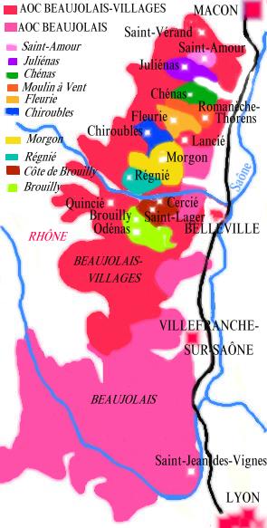 Il compte douze appellations : Beaujolais (sur la moitié sud et le long de la Saône), Beaujolais villages (sur 38 communes au centre et à l’ouest) et dix crus sur la moitié septentrionale, en remontant vers le nord : Côte de Brouilly, Brouilly, Régnié, Morgon, Chiroubles, Fleurie, Moulin-à-vent, Chénas, Juliénas et Saint-Amour.